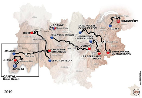 1 Aurillac-Jussac, 142 km 1. Edvald Boasson Hagen (Nor) en 3h24'33" 2. Philippe Gilbert (Bel) 3. Wout Van Aert (Bel) 4. Nils Politt (All) 5. Gregor Muhlberger (Aut) 6. Sonny Colbrelli (Ita) 7. Jonas Koch (All) 8. Alexey Lutsenko (Kaz) 9. Benoît Cosnefroy (Fra) 10. Michal Kwiatkowski (Pol) 2. Philippe Gilbert (Bel) à 4" 3. Wout Van Aert (Bel) à 6" 2 Mauriac-Craponne-sur-Arzon, 180 km 1. Dylan Teuns (Bel) en 4h12'41" 2. Guillaume Martin (Fra) 3. Jakob Fuglsang (Dan) à 13" 4. Thibaut Pinot (Fra) 5. Michael Woods (Can) 6. Alexey Lutsenko (Kaz) 7. Petr Vakoc (Tch) 8. Nairo Quintana (Col) 9. Wout Poels (Hol) 10. Adam Yates (Gbr) 2. Guillaume Martin (Fra) à 3" 3. Jakob Fuglsang (Dan) à 20" 3 Le Puy en Velay-Riom, 177 km 1. Sam Bennett (Irl) en 4h15'25" 2. Wout Van Aert (Bel) 3. Davide Ballerini (Ita) 4. Clément Venturini (Fra) 5. Edward Theuns (Bel) 6. Edvald Boasson Hagen (Nor) 7. Alvaro Jose Hodeg (Col) 8. Jens Debusschere (Bel) 9. Luka Mezgec (Slo) 10. Bjorg Lambrecht 2. Guillaume Martin (Fra) à 3" 3. Alexey Lutsenko (Kaz) à 20" 4 Roanne, 26.1 km CLM 1. Wout Van Aert (Bel) en 33'38" 2. Tejay Van Garderen (Usa) à 31" 3. Tom Dumoulin (Hol) à 47" 4. Steven Kruijswijk (Hol) à 49" 5. Emanuel Buchmann (All) à 51" 6. Adam Yates (Gbr) à 56" 7. Julian Alaphilippe (Fra) à 59" 8. Nils Politt (All) à 1'05" 9. Jakob Fuglsang (Dan) à 1'07" 10. Rémi Cavagna (Fra) à 1'10" 2. Dylan Teuns (Bel) à 4" 3. Tejay Van Garderen (Usa) à 6" 5 Boën-sur-Lignon-Voiron, 201 km 1. Wout Van Aert (Bel) en 5h00'34" 2. Sam Bennett (Irl) 3. Julian Alaphilippe (Fra) 4. Lorrenzo Manzin (Fra) 5. Clément Venturini (Fra) 6. Edvald Boasson Hagen (Nor) 7. Zdenek Štybar (Tch) 8. Sonny Colbrelli (Ita) 9. Philippe Gilbert (Bel) 10. Mads Würtz Schmidt (Dan) 2. Dylan Teuns (Bel) à 4" 3. Tejay Van Garderen (Usa) à 6" 6 Saint-Vulbas-Saint-Michel-de-Maurienne, 229 km 1. Julian Alaphilippe (Fra) en 6h00'54" 2. Gregor Muhlberger (Aut) 3. Alessandro De Marchi (Ita) à 22" 4. Wout Poels (Hol) à 6'10" 5. Gorka Izagirre (Esp) 6. Jakob Fuglsang (Dan) 7. Jack Haig (Aus) 8. Adam Yates (Gbr) 9. Nairo Quintana (Col) 10. Alexey Lutsenko (Kaz) 2. Dylan Teuns (Bel) à 4" 3. Tejay Van Garderen (Usa) à 6" 7 Saint-Genix-les-Villages-Pipay (les Sept Laux), 133.5 km 1. Wout Poels (Hol) en 4h01'34" 2. Jakob Fuglsang (Dan) à 1" 3. Emanuel Buchmann (All) 4. Thibaut Pinot (Fra) à 10" 5. Daniel Martin (Irl) 6. Adam Yates (Gbr) 7. Romain Bardet (Fra) à 13" 8. Tejay Van Garderen (Usa) à 16" 9. Dylan Teuns (Bel) à 30" 10. Bjorg Lambrecht (Bel) à 34" 2. Adam Yates (Gbr) à 8" 3. Tejay Van Garderen (Usa) à 20" 8 Cluses-Champéry (Sui), 113.5 km 1. Dylan van Baarle (Hol) en 3h05'48" (moy : 36.652 km/h) 2. Jack Haig (Aus) 3. Carl Fredrik Hagen (Nor) à 50" 4. Warren Barguil (Fra) à 1'12" 5. Sepp Kuss (Usa) 6. Sébastien Reichenbach (Sui) 7. Julian Alaphilippe (Fra) à 1'16" 8. Alexey Lutsenko (Kaz) à 1'59" 9. Xandro Meurisse (Bel) 10. Emanuel Buchmann (All)