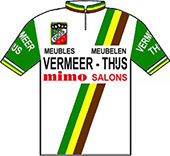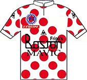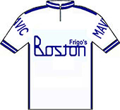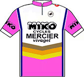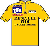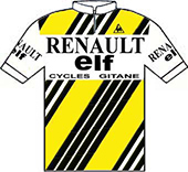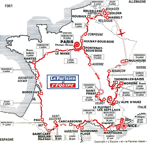sur cette 68° édition du Tour. Quatre chronos individuels, deux chronos par équipes, la montagne dès le 5ème jour caractérisent ce Tour de France.Face à une opposition en petite forme, Phil Anderson se révèle au grand public en devenant le 1er Australien à revêtir le maillot jaune. Contrôlant facilement ses adversaires, Bernard Hinault finit par les assommer et remporte son 3ème Tour de France avec une marge importante. Le Tour 1981 établit deux nouveaux records : le nombre d'arrivants : 121 contre 104 en 1974 et la meilleure moyenne horaire : 37.844 km/h contre 37.306 en 1962 (Anquetil). Le parcours - Les partants - Les étapes - Les classements Histoire des maillots ![]() carte : L'Équipe et le parisien Libéré. profils : journal l'Equipe et Les Sports. maillots : Jean-Louis Bey Étapes du 25 juin au 19 juillet 1981 Prol. Nice, 5.8 km CLM 1 Nice - Nice, 97 km 2 Nice - Antibes - Nice, 40 km CLM par équipes 3 Nice - Martigues, 254 km 4 Martigues - Narbonne, 232 km 5 Narbonne - Carcassonne, 77.2 km CLM par équipes 6 Saint-Gaudens - Saint-Lary-Soulan, 117.5 km 7 Nay - Pau, 26.7 km CLM 8 Pau - Bordeaux, 227 km 9 Rochefort-sur-Mer - Nantes, 182 km 10 Nantes - Le Mans, 196.5 km 11 Le Mans - Aulnay-sous-Bois, 258.5 km 12 Compiègne - Roubaix, 246 km 13 Roubaix - Bruxelles (Bel), 105.5 km 14 Bruxelles (Bel) - Zolder (Bel), 133.5 km 15 Beringen (Bel) - Hasselt (Bel), 157 km 16 Mulhouse-Mulhouse, 38.5 km CLM 17 Besançon - Thonon-les-Bains, 231 km 18 Thonon- les-Bains - Morzine, 199.5 km 19 Morzine - L'Alpe-d'Huez, 230.5 km 20 Bourg-d'Oisans - Le Pleynet, 131 km 21 Veurey-Voroize - Saint-Priest, 117.5 km 22 Saint-Priest, 46.5 km CLM 23 Auxerre - Fontenay-sous-Bois, 207 km 24 Fontenay-sous-Bois - Paris/Champs Elysées, 186.8 km La petite histoire : - Phil Anderson premier Australien porteur du Maillot Jaune. Journée de repos : samedi 4 juillet à Nantes, lundi 13 juillet à Morzine Les nouveautés : - Retour aux bonifications aux arrivées des étapes de plaine. - Nouvelles villes étapes : Aulnay sous Bois, Le Pleynet-les-Sept-Laux, Veurey-Voroize, Nay, Zolder, Beringen, Hasselt. - Ascensions inédites : col de Joux-Verte, Le Pleynet-les-Sept-Laux, col de La Ramaz, col de Joux-Verte. Les barêmes : Maillot jaune : - étapes : 30", 20" et 10" sur les étapes 4, 8, 9, 10, 11, 15, 21 & 23. - étape volante : bonification de 30", 20" et 10" sur l' étape 3 - rush Talbot : bonifications de 12", 8" et 4" pour les étapes 4, 8, 9, 10, 11, 15, 21 & 23. Maillot vert : - étapes de plat : 35, 30, 26, 22, 18, 15, 12, 10, 8, 6, 5, ..., 1 pt pour les 15 premiers - étapes de montagne : 12, 11, 10, 9, 8, ..., 1 pt aux 12 premiers - étapes CLM : 10, 8, 6, 5, 4, 3, 2, 1 pt pour les 8 premiers - prologue : les 6 premiers : 6, 5, 4, 3, 2, 1 pt - Rush Talbot : 8, 5, 3 pts aux 3 premiers. Les sponsors : - Étapes : MERLIN-PLAGE - Classement général, "maillot jaune" : MIKO - Classement individuel par points, "maillot vert", et des équipes par points "casquettes vertes" : MICHELIN - Classement du meilleur grimpeur, "maillot à pois" : CAMPAGNOLO - Classement du meilleur jeune, "maillot blanc" : ALFA LAVAL - Classement "combiné" : TF1 - Sprints "rush" : TALBOT - Classement au temps par équipes : LE COQ SPORTIF - Le prix de la combativité : BANANIA - Divers : Équipier "BNP", Amabilité "TERA XYL", Fair-Play "WOLBER" ![]() TI RALEIGH-CREDA Directeur sportif : Peter POST & DE WEVER Jules ![]() 1 ZOETEMELK Joop (Hol) 2 FREULER Urs (Sui) ab.17° 3 HOSTE Frank (Bel) 4 KNETEMANN Gerrie (Hol) 5 LUBBERDING Henk (Hol) 6 PEETERS Ludo (Bel) 7 PRIEM Cees (Hol) ab.16° 8 VAN DEN HOEK Ad (Hol) 9 VAN DER VELDE Johan (Hol) 10 WIJNANDS Ad (Hol) ab.17° PEUGEOT-ESSO-MICHELIN Directeur sportif : Maurice DE MUER & Roland BERLAND ![]() 11 BERNAUDEAU Jean-René (Fra) 12 ANDERSON Phil (Aus) 13 BOSSIS Jacques (Fra) 14 BOURREAU Bernard (Fra) 15 DUCLOS-LASSALLE Gilbert (Fra) 16 JONES Graham (Gbr) 17 LAURENT Michel (Fra) 18 LEGEAY Roger (Fra) 19 LINARD Hubert (Fra) 20 PERRET Patrick (Fra) MIKO-MERCIER-VIVAGEL Directeur sportif : Jean-Pierre DANGUILLAUME & Maurice QUENTIN ![]() 21 MARTIN Raymond (Fra) 22 ANDERSEN Kim (Dan) ab.7° 23 CLÈRE Régis (Fra) 24 FRIOU Patrick (Fra) 25 GALLOPIN Joël (Fra) 26 GAUTHIER Jean-Louis (Fra) 27 LEBAUD Didier (Fra) hd.17° 28 LEVAVASSEUR Christian (Fra) 29 MATHIS Hubert (Fra) 30 SEZNEC Christian (Fra) WICKES-SPLENDOR-EUROP DECOR Directeur sportif : Albert DE KIMPE & Lucien LANDUYT ![]() 31 DE MUYNCK Johan (Bel) 32 BROERS Johnny (Hol) 33 COLMAN Rudi (Bel) 34 CRIQUIELION Claude (Bel) 35 KELLY Sean (Irl) 36 NILSSON Sven Ake (Sue) 37 PLANCKAERT Eddy (Bel) ab.17° 38 PLANCKAERT Walter (Bel) ab.17° 39 URBANY Eugène (Lux) 40 VAN CALSTER Guido (Bel) ab.19° SEM-FRANCE LOIRE-CAMPAGNOLO Directeur sportif : Jean DE GRIBALDY & Brik SCHOTTE ![]() 41 AGOSTINHO Joachim (Por) ab.20° 42 BEUCHERIE Serge (Fra) 43 CLERC Patrick (Fra) hd.13° 44 HOSOTTE Jean-Paul (Fra) 45 HOSOTTE Patrick (Fra) 46 MENDES Fernando (Por) ab.8° 47 MICHAUD Jacques (Fra) 48 MOERLEN Patrick (Sui) 49 ZWEIFEL Albert (Sui) 50 TINAZZI Marcel (Fra) LA REDOUTE-MOTOBECANE Directeur sportif : Philippe CRÉPEL & Jos BRAECKEVELDT ![]() 51 ALBAN Robert (Fra) 52 BAZZO Pierre (Fra) 53 DURANT Luc (Fra) 54 MARTINEZ Mariano (Esp) 55 PESCHEUX Jean-François (Fra) 56 SHERWEN Paul (Gbr) hd.17° 57 VALLET Bernard (Fra) 58 VANDENBROUCKE Jean-Luc (Bel) 59 VAN DEN HAUTE Ferdi (Bel) 60 VANOVERSCHELDE Didier (Fra) CAPRI SONNE-KOGA MIYATA Directeur sportif : Walter GODEFROOT & Patrick LEFEVERE ![]() 61 WILLEMS Daniel s(Bel) ab.23° 62 CLAES Ronny (Bel) 63 DELCROIX Ludo (Bel) 64 DE ROOY Theo (Hol) 65 JACOBS Joseph (Bel) 66 PEVENAGE Rudy (Bel) 67 VAN DE WIELE Eric (Bel) ab.6° 68 WAYENBERG Dirk (Bel) 69 WILLMANN Jostein (Nor) 70 WINNEN Peter (Hol) PUCH-WOLBER-CAMPAGNOLO Directeur sportif : Marcel BOISHARDY ![]() 71 THÉVENET Bernard (Fra) 72 ARNAUD Dominique (Fra) 73 CHASSANG Jean (Fra) 74 DE CARVALHO Alain (Fra) 75 HÉZARD Yves (Fra) 76 OSMONT Jacques (