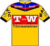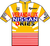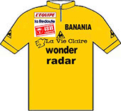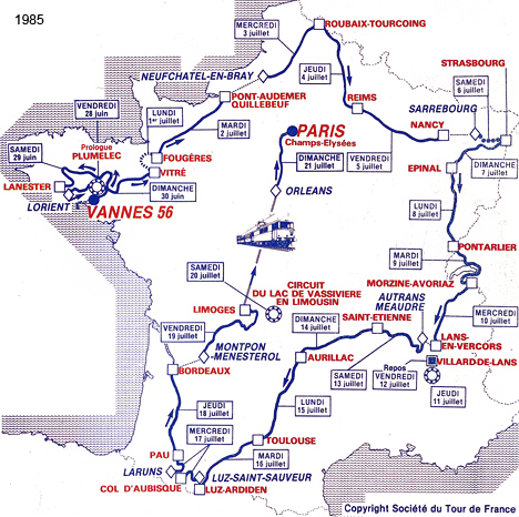 son leader, tout en étant son plus grand adversaire. L'Américain remporte d'ailleurs le dernier contre-la-montre.1985 c'est aussi le 1er Tour de France d'un certain Miguel Indurain. Le parcours - Les partants - Les étapes - Les classements Histoire des maillots ![]() profils : journal l'Equipe & Le Parisien maillots : Jean-Louis Bey Étapes du 28 juin au 21 juillet 1985 Prol. Plumelec, 6.8 km CLM 1 Vannes - Lanester, 256 km 2 Lorient - Vitré, 242 km 3 Vitré - Fougères, 73 km CLM par équipes 4 Fougères - Pont-Audemer, 239 km 5 Neufchatel-en-Bray - Tourcoing, 224 km 6 Tourcoing - Reims, 221.5 km 7 Reims - Nancy, 217.5 km 8 Sarrebourg - Strasbourg, 75 km CLM 9 Strasbourg - Épinal, 173.5 km 10 Épinal - Pontarlier, 204.5 km 11 Pontarlier - Morzine-Avoriaz, 195 km 12 Morzine - Lans-en-Vercors, 269 km 13 Villard-de-Lans, 38 km CLM 14 Autrans - Saint-Étienne, 179 km 15 Saint-Étienne - Aurillac, 237.5 km 16 Aurillac - Toulouse, 247 km 17 Toulouse - Luz-Ardiden, 209.5 km 18-1 Luz-Saint-Sauveur - Col d'Aubisque, 52.5 km 18-2 Laruns - Pau, 83.5 km 19 Pau - Bordeaux, 203 km 20 Montpon-Ménestérol - Limoges, 225 km 21 Circuit du Lac de Vassivière, 45.7 km CLM 22 Orléans - Paris, 196 km La petite histoire : - Bernard Hinault rejoint Anquetil et Merckx dans la légende avec cinq victoires dans le Tour de France. - LeMond signe au Lac de Vassivière la première victoire américaine dans le Tour. - Stephen Roche, premier Irlandais sur le podium. - A noter la 1ère participation de Miguel Indurain (100e du prologue, abandon 4è étape). Les nouveautés : - Apparition dans le Tour de nouveaux accessoires (pédales automatiques, roues lenticulaires). - Nouvelles villes étapes : Pont-Audemer, Vitré, Lanester, Fougères, Neufchâtel-en-Bray, Sarrebourg, Lans-en-Vercors, Villard-de-Lans, Autrans, Luz-Ardiden, Laruns, Montpon-Ménesterol. - Ascensions inédites : Luz-Ardiden, Champ du Feu. - 180 coureurs au départ, record absolu (ancien record : 170 coureurs en 1928, 1982, 1984). Jour de repos : 12 juillet à Grenoble. Les barêmes : Maillot jaune : - étape de plat : 30", 20" et 10" aux 3 premiers des étapes 1, 2, 4, 5, 6, 7, 9, 15, 16, 19 & 20. - étape volante : 30", 20" et 10" aux 3 premiers des étapes 4 & 11. - catch : 10", 6" et 3" à tous les "catch". Maillot vert (par points) : - barême unique identique pour toutes les étapes de plat, CLM et montagne : de 25 pts à 1 pt aux 25 premiers. Maillot à pois (montagne) : - Hors-catégorie (HC) : 40, 35, 30, 26, 22, 18, 16, 14, 12, 10, 8, 6, 4, 2 & 1 pt aux 15 premiers - 1ère catégorie : 30, 26, 22, 18, 14, 12, 10, 8, 6, 4, 2 & 1 pt aux 12 premiers - 2ème cat. : 20, 15, 12, 10, 8, 6, 4, 3, 2 & 1 pt aux 10 premiers - 3ème cat. : 7, 5, 4, 3, 2 & 1 pt aux 6 premiers - 4ème cat. : 4, 2 & 1 pt aux 3 premiers Maillot rouge (sprints "catch") : - de la 1ère à la 5ème étape : 3, 2 & 1 pt - de la 6ème à la 11ème étape : 6, 4 & 2 pts - de la 12ème à la 17ème étape : 9, 6 & 3 pts - de 18ème à la 22ème étape : 12, 8 & 4 pts Maillot blanc : - attribué au meilleur néophyte du Tour. Les sponsors : - Étapes : MERLIN-PLAGE - Classement général, "maillot jaune" : BANANIA - Classement individuel par points, "maillot vert", et des équipes par points : BP - Classement du meilleur grimpeur, "maillot à pois" : CAFÉ DE COLOMBIA - Classement du meilleur néophyte, "maillot blanc" : SUPER CROIX - Trophée du meilleur rouleur : LA REDOUTE - Sprints "catch", "maillot rouge" : CATCH - Combiné : TOSHIBA - Classement au temps par équipes : RYOBI ![]() RENAULT-ELF Directeur sportif : Cyrille GUIMARD & Bernard QUILFEN ![]() 1 CHEVALLIER Philippe (Fra) 2 GAIGNE Dominique (Fra) 3 GAYANT Martial (Fra) hd.15° 4 LAVAINNE Christophe (Fra) hd.15° 5 MADIOT Marc (Fra) 6 MADIOT Yvon (Fra) 7 MARIE Thierry (Fra) 8 MOTTET Charles (Fra) 9 POISSON Pascal (Fra) 10 ROUX Denis (Fra) LA VIE CLAIRE Directeur sportif : Paul KOECHLI & Maurice LE GUILLOUX ![]() 11 HINAULT Bernard (Fra) 12 ANDERSEN Kim (Dan) 13 ARNAUD Dominique (Fra) 14 BAUER Steve (Can) 15 GOMEZ Marc (Fra) 16 JOURDAN Christian (Fra) 17 LEMOND Greg (Usa) 18 RUTTIMANN Niki (Sui) 19 VALLET Bernard (Fra) 20 VIGNERON Alain (Fra) PEUGEOT-SHELL Directeur sportif : Roland BERLAND & Roger LEGEAY ![]() 21 MILLAR Robert (Gbr) 22 BRUN Frédéric (Fra) 23 CASTAING Francis (Fra) 24 DUCLOS-LASSALLE Gilbert (Fra) 25 FOREST Robert (Fra) 26 FREBERT Yvan (Fra) 27 LINARD Hubert (Fra) 28 PEIPER Alan (Aus) 29 SIMON Pascal (Fra) 30 YATES Sean (Gbr) SKIL-SEM Directeur sportif : Jean DE GRIBALDY & Christian RUMEAU ![]() 31 KELLY Sean (Irl) 32 BITTINGER René (Fra) 33 CARITOUX Eric (Fra) 34 GALLOPIN Guy (Fra) 35 GARDE Dominique (Fra) 36 MAS Gilles (Fra) 37 PELIER Joël (Fra) 38 POISSONNIER Philippe (Fra) 39 VAN MEER Jacques (Hol) 40 VICHOT Frédéric (Fra) REYNOLDS Directeur sportif : Jose Miguel ECHEVARRI & Eusebio UNZUE ![]() 41 AJA Enrique (Esp) 42 CHOZAS Eduardo (Esp) 43 GASTON Inaki (Esp) 44 GONZALEZ Eduardo (Esp) hd.12° 45 HERNANDEZ Carlos (Esp) 46 HERNANDEZ-UBEDA Jesus-Maria (Esp) 47 INDURAIN Miguel (Esp) ab.4° 48 LAGUIA José-Luis (Esp) ab.9° 49 NAVARRO Francisco (Esp) hd.4° 50 PRIETO Celestino (Esp) FAGOR Directeur sportif : Luis OCANA & Serge BEUCHERIE ![]() 51 MUNOZ Pedro (Esp) ab.15° 52 BAGOT Jean-Claude (Fra) 53 BAZZO Pierre (Fra) 54 BERNAUDEAU Jean-René (Fra) ab.12° 55 BIBOLLET Michel (Fra) 56 DE WOLF Fons (Bel) hd.Prol. 57 EARLEY Martin (Irl) 58 EMONDS Nico (Bel) ab.15° 59 LAURAIRE Philippe (Fra) 60 LEMARCHAND François (Fra) HITACHI-SUNAIR-SPLENDOR Directeur sportif : Albert DE KIMPE & Luc LANDUYT ![]() 61 CRIQUIELION Claude (Bel) 62 BIONDI Laurent (Fra) 63 DEVOS Hendrik (Bel) 64 DHAENENS Rudy (Bel) 65 MATTHIJS Rudy (Bel) 66 ROGIERS Rudy (Bel) 67 THURAU Dietrich (All) él.10° 68 TOELEN Patrick (Bel) 69 VANDENBRANDE Jean-Philippe (Bel) 70 WAMPERS Jean-Marie (Bel) PANASONIC-RALEIGH Directeur sportif : Peter POST & Jules DE WEVER ![]() 71 ANDERSON Phil (Aus) 72 DE KEULENAER Ludo (Bel) 73 DE ROOY The