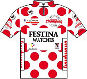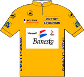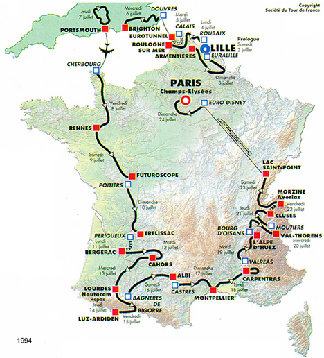 un finish impressionnant d'Ugrumov et de Pantani.Le parcours - Les partants - Les étapes - Les classements Histoire des maillots ![]() carte : Société du Tour de France profils : journal l'Equipe maillots : Jean-Louis Bey Étapes du 2 au 24 juillet 1994 Prol. Lille/Euralille, 7.2 km CLM 1 Lille/Euralille - Armentières, 234 km 2 Roubaix - Boulogne sur Mer, 203.5 km 3 Calais - Eurotunnel, 66.5 km CLM par équipes 4 Douvres (Gbr) - Brighton (Gbr), 204.5 km 5 Portsmouth (Gbr) - Portsmouth, 187 km 6 Cherbourg - Rennes, 270.5 km 7 Rennes - Futuroscope, 259.5 km 8 Poitiers - Trélissac, 218.5 km 9 Périgueux - Bergerac, 64 km CLM 10 Bergerac - Cahors, 160.5 km 11 Cahors - Lourdes/Hautacam, 263.5 km 12 Lourdes - Luz Ardiden, 204.5 km 13 Bagnères-de-Bigorre - Albi, 223 km 14 Castres - Montpellier, 202 km 15 Montpellier - Carpentras, 231 km 16 Valréas - L'Alpe-d'Huez, 224.5 km 17 Bourg-d'Oisans - Val Thorens, 149 km 18 Moutiers - Cluses, 174.5 km 19 Cluses - Morzine/Avoriaz, 47.5 km CLM 20 Morzine - Lac St Point, 208.5 km 21 Eurodisney - Paris/Champs Elysées, 175 km La petite histoire : - Le plus lourd et le plus grand du peloton remporte l'étape du Ventoux après y être passé au sommet en tête : Eros POLI. Les nouveautés : - Jean-Marie LEBLANC devient directeur du Tour de France. - Étape commémorative de la Bataille de Normandie : Cherbourg-Rennes avec un passage à Utah Beach, Sainte-Mère-l'Eglise et Saint-Lô pour le 50 ème anniversaire du débarquement. - La caravane se rend en Angleterre par le Tunnel sous la Manche. - 1 contre-la-montre par équipes Calais-Eurotunnel 66.5 km. - 3 contre-la-montre individuels : prologue Lille-Euralille 7.2 km, Périgueux-Bergerac 64 km, Cluses-Morzine Avoriaz 47.5 km. - 5 arrivées en altitude : Hautacam, Luz-Ardiden, L'Alpe-d'Huez, Val Thorens, Morzine-Avoriaz (clm) - Nouvelles villes étapes : Calais, Armentières, Dover, Brighton, Portsmouth, Trélissac, Cluses, Cahors. - Nouveaux cols et ascensions : Hautacam, Val Thorens, La Croix-Fry, Les Gets, Menée, Val Thorens. - Journée de repos : jeudi 14 juillet à Lourdes. Les classements : - de la 1ère à la 10ème étape, bonification de 20", 12" et 8" aux trois premiers - de la 1ère à la 10ème étape, bonification de 6", 4" et 2" aux trois premiers des sprints intermédiaires. - points étapes plat : 35, 30, 26, 24, 22, 20, 19, 18, ..., 1 aux 25 premiers - points étapes accidentées : 25, 22, 20, 18, 16, 15, 14, ..., 1 aux 20 premiers - points étapes montagne : 20, 17, 15, 13, 12, 10, 9, 8, ..., 1 aux 15 premiers - points étapes CLM : 15, 12, 10, 8, 6, 5, 4, 3, 2, 1 aux 10 premiers - points sprints intermédiaires : 6, 4 et 2 aux trois premiers des sprints intermédiaires. - points cols 4° cat. : 5, 3, 1 - points cols 3° cat. : 10, 7, 5, 3, 1 - points cols 2° cat. : 20, 15, 12, 10, 8, 6, 4, 3, 2, 1 - points cols 1° cat. : 30, 26, 22, 18, 14, 12, 10, 8, 6, 4, 2, 1 - points cols cat.HC : 40, 35, 30, 26, 22, 18, 16, 14, 12, 10, 8, 6, 4, 2, 1 Les sponsors : - Étapes : COCA COLA - Classement général, "maillot jaune" : CRÉDIT LYONNAIS - Classement individuel par points, "maillot vert" : PMU - Classement du meilleur grimpeur, "maillot à pois" : CHAMPION - Classement au temps par équipes "casquettes jaunes" : CRÉDIT LYONNAIS - Classement du meilleur jeune : / ![]() BANESTO Directeur sportif : Jose Miguel ECHEVARRI & Eusebio UNZUE ![]() 1 INDURAIN Miguel (Esp) 2 ALONSO Marino (Esp) ab.17° 3 APARICIO Vicente (Esp) 4 BERNARD Jean-François (Fra) 5 GONZALEZ ARRIETA Ramon (Esp) 6 MAURI Melchor (Esp) 7 NIJBOER Erwin (Hol) 8 RUÉ Gérard (Fra) 9 URIARTE José Ramon (Esp) MAPEI-CLAS Directeur sportif : Jesus SUAREZ CUEVAS & Martin Juan FERNANDEZ ![]() 11 ROMINGER Tony (Sui) ab.13° 12 BORTOLAMI Gianluca (Ita) 13 ECHAVE Federico (Esp) 14 EMONDS Nico (Bel) ab.14° 15 ESCARTIN Fernando (Esp) 16 GONZALEZ Arsenio (Esp) 17 MÜLLER Jörg (Sui) 18 OLANO Abraham (Esp) 19 UNZAGA Jon (Esp) np.15° GB-MG TECHNOGYM Directeur sportif : Giancarlo FERRETTI & Patrick LEFEVERE ![]() 21 MUSEEUW Johan (Bel) 22 BOMANS Carlo (Bel) 23 CASSANI Davide (Ita) 24 ELLI Alberto (Ita) 25 JAERMANN Rolf (Sui) 26 PEETERS Wilfried (Bel) ab.16° 27 SØRENSEN Rolf (Dan) 28 VANZELLA Flavio (Ita) 29 VONA Franco (Ita) MOTOROLA Directeur sportif : James OCHOWICZ & Hennie KUIPER ![]() 31 ARMSTRONG Lance (Usa) np.15° 32 ALCALA Raul (Mex) 33 ANDERSON Phil (Aus) 34 ANDREU Frankie (Usa) 35 BAUER Steve (Can) np.5° 36 DERNIES Michel (Bel) 37 MEJIA Alvaro (Col) 38 SWART Stephen (Nzl) 39 YATES Sean (Gbr) GEWISS-BALLAN Directeur sportif : Emmanuele BOMBINI & Paolo ROSOLA ![]() 41 RIIS Bjarne (Dan) 42 BOBRIK Vladislav (Rus) 43 BONTEMPI Guido (Ita) 44 BOTTARO Dario (Ita) 45 CENGHIALTA Bruno (Ita) 46 FURLAN Giorgio (Ita) 47 MINALI Nicola (Ita) ab.12° 48 UGRUMOV Piotr (Let) 49 ZAINA Enrico (Ita) CARRERA JEANS-TASSONI Directeur sportif : Sandro QUINTARELLI & Giuseppe MARTINELLI ![]() 51 CHIAPPUCCI Claudio (Ita) np.12° 52 ARTUNGHI Marco (Ita) ab.14° 53 BERTOLINI Alessandro (Ita) ab.12° 54 CHIESA Mario (Ita) 55 MANTOVAN Mario (Ita) ab.18° 56 PANTANI Marco (Ita) 57 POULNIKOV Vladimir (Ukr) 58 ROSSI Remo (Ita) 59 ZBERG Beat (Sui) ONCE Directeur sportif : Manolo SAIZ & Sebastian POZO ![]() 61 ZÜLLE Alex (Sui) 62 BREUKINK Erik (Hol) 63 DIAZ ZABALA Herminio (Esp) 64 DUFAUX Laurent (Sui) 65 JALABERT Laurent (Fra) np.2° 66 LEANIZBARRUTIA Alberto (Esp) 67 RINCON Oliverio (Col) ab.16° 68 SIERRA Roberto (Esp) np.14° 69 STEPHENS Neil (Aus) LAMPRE-PANARIA Directeur sportif : Pietro ALGERI & Maurizio PIOVANI ![]() 71 TONKOV Pavel (Rus) ab.14° 72 CONTI Roberto (Ita) 73 FARESIN Gianni (Ita) np.12° 74 GALLETTI Alessio (Ita) ab.16° 75 GONTCHENKOV Alexander (Ukr) np.2° 76 LIETTI Marco (Ita) ab.14° 77 SERPELLINI Marco (Ita) ab.16° 78 SVORADA Jan (Svq) 79 ZEN Marco (Ita) GAN Directeur sportif : Roger LEGEAY & Serge BEUCHERIE ![]() 81 DOJWA Jean-Philippe (Fra) ab.13° 82 BOARDMAN Christopher (Gbr) ab.11° 83 CAPELLE Christophe (Fra) ab.14° 84 COLOTT