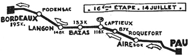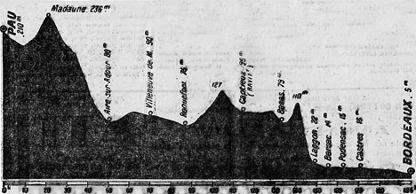 10h30 (Basses-Pyrénées) : Pau/Rte de Bordeaux (km 0) - Astis (km 18) - Lalonquette (km 24) - Boueilho (km 28) - (Landes) : Sarron (km 37) - Aire sur l'Adour (km 50) - Saint-Gein (km 65) - Villeneuve de Marsan (km 71) - Roquefort (km 87) - (Gironde) : Captieux (km 116-ravitaillement) - Beaulac (km 125) - Bazas (km 133) - Langon (km 148) - Preignac (km 153) - Barsac (km 156) - Cerons (km 159) - Podensac (km 162) - Virelade (km 164) - Arbanats (km 168) - Castres (km 171) - Pont de la Maye (km 188) - Bordeaux / Parc des sports (km 195).