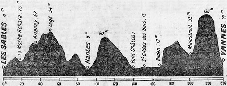 8h30 (Vendée) Les Sables d'Olonne (km 0) - St-Mathurin (km 10) - La Motte-Achard (km 17) - Beaulieu sous la Roche (km 25) - Aizenay (km 32) - La Chapelle-Palluau (km 38) - Palluau (km 40) - (Loire-Inférieure) : Legé (km 50) - St-Etienne de C. (km 60) - Viais (km 78) - Les Sorinières (km 82) - Pont-Rousseau (km 86) - Nantes (km 90) - Sautron (km 101) - Le-Temple-de-Bretagne (km 112) - La Moère (km 123) - Pont-Château (km 139-ravitaillement) - Dreffeac (km 145) - Saint-Gildas des Bois (km 149) - Frégréac (km 148) - (Ille-et-Vilaine) : Redon (km 167) - (Morbihan) : St-Perreux (km 171) - St-Vincent (km 176) - Peillac (km 181) - St-Grave (km 186) - St-Congard (km 193) - Malestroit (km 201) - Elven (km 220) - Vannes / rue de Rennes (km 236).