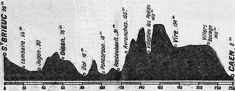 8h30 (Côtes-du-Nord) : Saint-Brieux /rte nationale (km 0) - Langueux (km 4) - Yffiniac (km 7) - Saint René (km 9) - Lamballe (km 20)- Noyal (km 24) - Jugon (km 37) - Vildé-Guingalan (km 50) - Dinan (km 59) - Lanvallay (km 61) - Saint-Piat (km 63) - (Ille-et-Villaine) : Le Vieux-Bourg (km 72) - Dol-de-Bretagne (km 85) - Baguer-Pican (km 89) - (Manche) : Pontorson (km 104) - Bré (km 109) - Précey (km 115) - Pontaubault (km 119) - Avranches (km 126-ravitaillement) - Sainte-Pience-le-Parc (km 137) - Chevreuil-du-Tronchet (km 146) - Villedieu-les-Poêles (km 148) - Sainte-Cécile (km 151) - (Calvados) : Fontenermont (km 157) - Saint-Sever (km 162) - Vire (km 176) - La Ferronnière (km 188) - Montamy (km 195) - Le-Mesnil-Auzouf (km 196) - Jurques (km 201) - Quéry (km km 205) - Villers-Bocage (km 210) - Noyers (km 218) - Mondrainville (km 223) - Verson (km 227) - Bretteville-sur-Odon (km 231) - Caen / vél. de Venoix (km 233).