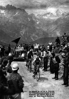 - Les primes ne manquent pas dans les localités de l'Oisans et provoquent quelques mouvements sans conséquences dans le peloton. Camellini crève avant Rochetaillée (km 42) et revient à peine au moment d'attaquer l'ascension du Glandon et de la Croix-de-Fer. Camellini se place en tête du peloton et mène un train soutenu. Immédiatement le ruban multicolore s'étire sérieusement. Lazaridès, Klabinski, Goasmat, Ronconi, Brambilla & Fachleitner sautent dans sa roue et distancent immédiatement un 2ème groupe dans lequel on trouve Vietto. Muller, Dessertine et Piot sont les premiers lâchés dès le Glandon. Plus loin, Bobet doit changer de boyau. Camellini accélère et bientôt il ne reste dans sa roue que son co-équipier Klabinski et Lazaridès qui va céder un peu plus loin. Les Français sont en difficulté dans cette monté de même qu'Impanis ou Robic qui fanfaronne moins qu'hier. Vers l'avant Vietto n'a plus que Cogan à ses côtés mais avec Pontet, ils vont revenir sur le groupe de chasse composé de Ronconi, Cottur, Rossello, Brambilla pour les Italiens, Mathieu, Gyselinck, Breuer, Oreel pour les Belges ainsi que Goasmat. Au sommet (km 71.5) : Camellini et Klabinski, à 3'05" Lazaridès, à 4'55" Brambilla et Ronconi, à 5'10" Cottur, Goasmat, Fachleitner, Rossello, Breuer, à 8'05" Oreel, Gyselinck, Corrieri, à 8'56" Pontet, Mathieu, Piot, Cogan, Vietto. Suivent plus loin : G. Weilenmann, Goldschmidt et encore plus loin Robic.