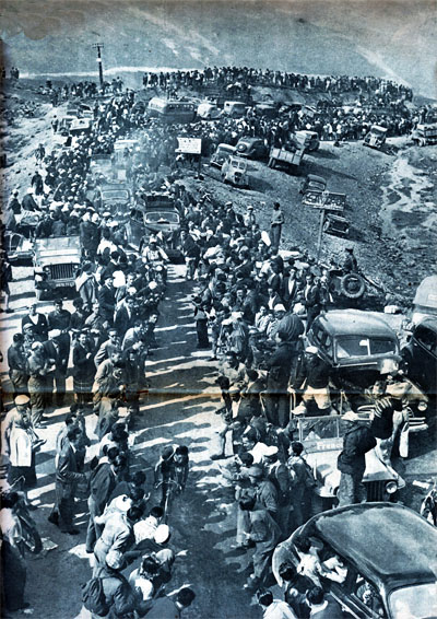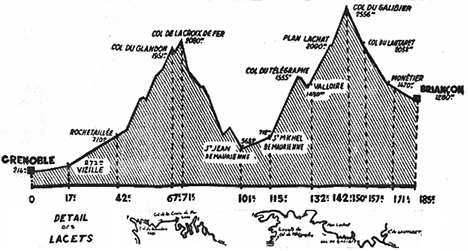 - Valloire et Plan Lachat sont atteints sans problème et avec l'ascension du Galibier, l'état de la route se détériore. Un pointage au pied du dernier col donne Camellini suivi à 8' de Lazaridès qui a refait une partie de son retard. Dans l'ascension, Brambilla, qui en a assez de remorquer le maillot jaune, s'en va seul jouer sa carte. Ronconi se fera dépasser par Goasmat et Cottur un équipier qui ne l'attend pas non plus! A l'avant, Lazaridès fait un retour sensationnel sur Camellini en difficulté. Au sommet du Galibier (km 150) où, de mémoire d'anciens, on n'avait jamais vu autant de monde : Camellini en tête, à 2'55" Lazaridès, à 8'25" Brambilla & Goasmat, à 9'55" Cottur, à 10'10" Ronconi, à 10'15" Rossello, à 12'10" Fachleitner, à 12'15" Vietto, à 12'55" Cosson, à 14'05" Tacca & Thuayre... à 15'55" Robic, à 20'40" Bobet, Impanis & Pontet.