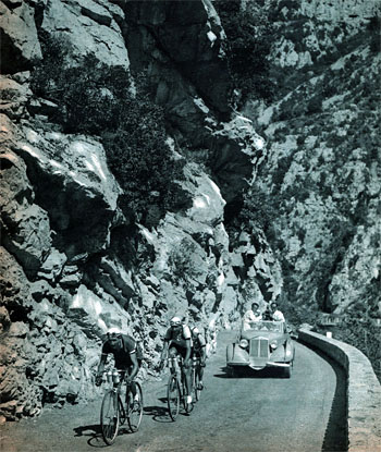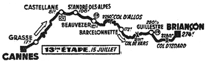 - C'est le calme plat dans la vallée du Verdon, on attend Allos. Vietto, ressaisi, attaque ce col au train et emmène le peloton. Meersman est le premier lâché avec Chupin. A mi-col, Dupont, Rémy et Tacca font une chute. Puis Lucien Teisseire attaque avec Paul Neri et Impanis dans son sillage. La bagarre est déclenchée. Robic s'installe rapidement au commandement des opérations. Au sommet, il passe seul, à 20" Teisseire, Brûlé et Lazaridès, à 40" Ockers & Impanis, à 1'02" Bartali, à 1'08" Neri, à 1'15" Bobet avec Klabinsky, Schotte, De Gribaldy, Molinéris... devançant un peloton éparpillé, Vietto est à 1'37", Géminiani à 1'50", Ronconi, à la peine, à 3'38".