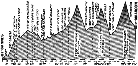 6h00 Cannes (km 0) - Mouans-Sartoux (km 10) - Grasse (km 17) - Col du Pilon (km 25.5) - St-Vallier (km 29) - Escragnolles (km 46.5) - Col de Valferrière (km 52) - Le Logis du Pin (km 62) - La Garde (km 75) - Castellane (km 81) - Saint-Julien (km 92) - St-André-des-Alpes (km 100) - Beauvezer (km 123-ravitaillement) - Colmars (km 128) - Allos (km 136) - Col d'Allos (km 152-GPM B) - Les Agneliers-Bas (km 162) - Barcelonnette (km 172) - Jausiers (km 180) - La Condamine (km 185) - St-Paul-s.-Ubaye (km 194) - Col de Vars (km 201.5 - GPM B) - Vars (km 211) - Guillestre (km 220.5-ravitaillement) - Pont de la Pierre (km 226) - Carr. GC 5-GC 2 (km 237.5) - Arvieux (km 241.5) - Brunissard (km 244.5) - Col d'Izoard (km 252.5-GPM A) - Briançon / Champ de Mars (km 274).
