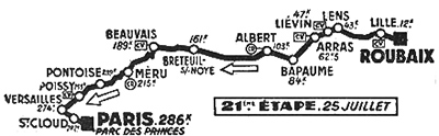8h00 : Roubaix / Av. de Paris (km 0) - Lille (km 12) - Seclin (km 23) - Lens (km 43) - Liévin (km 47) - Arras (km 62.5) - Ervilliers (km 78) - Bapaume (km 84) - Albert (km 103-ravitaillement) - Corbie (km 120.5) - Démuin (km 131) - Sourdon (km 148.5) - Breteuil-Noye (km 161) - Beauvais (km 189) - Bois-de-Molle (km 204) - Méru (km 215-ravitaillement) - Vallangoujard (km 227) - Pontoise (km 239) - St-Ouen l'Aumône (km 240) - Conflans-Ste-Honorine (km 247) - Poissy (km 255) - Saint-Germain (km 261) - Le Cœur-Volant (km 266) - Versailles (km 274) - Ville d'Avray (km 279) - St-Cloud-Montretout (km 282) - Boulogne (km 284) - Paris / Parc des Princes (km 286).