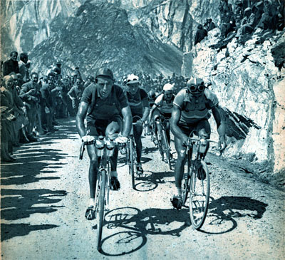 Dans le Grand St-Bernard, Coppi emmène Teisseire, Bartali & Robic.