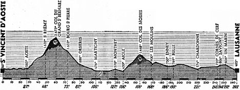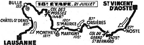 - C'est la promenade jusqu'à Aoste (km 27) où s'annoncent les premières pentes du Grand-Saint-Bernard qui, en 33 kilomètres, s'élève de 583 à 2473 mètres. Kubler est immédiatement lâché. G. Weilenmann lui tient compagnie, le pousse même, mais ne pourra éviter l'abandon de "Ferdi" chez lui en Suisse, incapable d'appuyer sur les pédales. En tête, les Italiens mènent à un train soutenu. A Saint-Oyen, presque à mi-col, sur une prime que remporte Diederich, une échappée se dessine. Robic en est l'auteur, mais Coppi, sans réclamer le secours de ses coéquipiers rétablit l'ordre. Sont lâchés, ou en difficulté : Magni, Ausenda, Kint, Vietto, Marcellak, De Santi, Pezzi, Martin et Camellini, lequel abandonne peu après. Robic accélère de nouveau et se détache avec Coppi, Lambrecht, Géminiani, Lévêque, De Mulder et Ockers. On remarque l'absence de Bartali dans cette petite fugue qui, toutefois, ne dure pas. A son tour, à quelques kilomètres du sommet, à la sortie du territoire italien, Teisseire attaque avec dans son sillage Robic, Coppi, Brûlé, Ockers, Lambrecht, De Mulder, Lucien Lazaridès et Bartali. Au sommet du col (km 60), les positions sont les suivantes : un groupe de 8 hommes qui passe dans cet ordre : Bartali, Coppi, Robic,Ockers, L. Lazaridès,De Mulder, Teisseire & Lambrecht, à 30" A. Lazaridès, Géminiani, Dupont, Marinelli & Goldschmit, à 45" Kirchen, Aeschlimann & Rossello etc. à 1'40" Chapatte, Tacca & Lauredi, à 2'20" Sciardis, à 2'30" Lauredi, ... Vietto à 8'32", Kint à 9'.