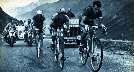 Derrière Piot et Robic parti à sa poursuite, Bobet devant Ockers et Bartali grimpent le Tourmalet.