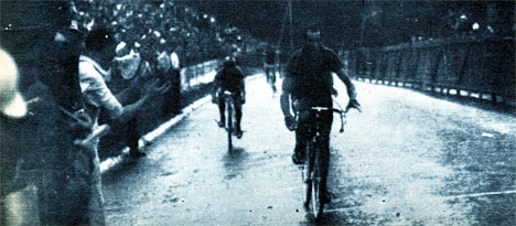 Sous la pluie, on distingue difficilement Bartali qui s'impose devant Bobet.