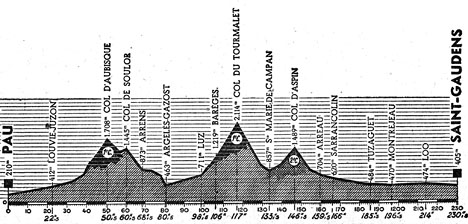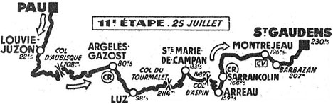 8h00 Pau (km 0) - Gan (km 4.5) - Rebenacq (km 12.5) - Sévignac-Meyracq (km 19) - Louvie-Juzon (km 22.5) - Bielle (km 26) - Laruns (km 32.5) - Eaux-Bonnes (km 38.5) - Col d'Aubisque (km 50.5-GPM1) - Col de Soulor (km 60.5) - Arrens (km 68.5) - Marsous (km 70.5) - Aucun (km 71.5) - Arras-en-Lavedan (km 77.5) - Argelès Gazost (km 80.5-ravitaillement) - Pierrefitte-Nestalas (km 87) - Luz (km 98.5) - Barèges (km 106) - Col du Tourmalet (km 117-GPM1) - Gripp (km 129.5) - Ste-Marie-de-Campan (km 133.5) - La Séoube (km 136.5) - Espiadet (km 141.5) - Col d'Aspin (km 146.5-GPM2) - Arreau (km 159.5) - Sarrancolin (km 166.5-ravitaillement) - Hèches (km 174) - La Barthe-de-Neste (km 180.5) - Escala (km 182.5) - Tuzaguet (km 185.5) - Anères (km 187.5) - Saint-Laurent-de-Neste (km 189.5) - Montrejeau (km 196.5) - Seilhan-Labroquière (km 203.5) - Lourès-Barousse (km 205) - Barbazan (km 207) - Sauveterre (km 211) - Loo (km 214) - Valentine (km 220.5) - Saint-Gaudens / circ. automobile (km 230.5).