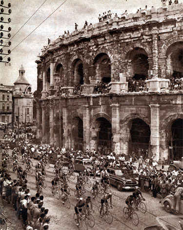 Les arènes romaines de Nîmes au départ de l'étape du jour.