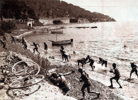 - Après Beauvallon (km 77), Jean Godschmidt et Bernard Gauthier s'arrêtent et vont piquer une tête dans l'eau! La moitié du peloton les imite et l'autre moitié les regarde. Même une partie des suiveurs s'y met. Tout le monde s'amuse comme des petits fous. Les coureurs repartent à moins de 30 km/h de moyenne et seules les crevaisons troublent le rythme de la course. Même dans l'Esterel il ne se passe rien sauf une dizaine de coureurs qui décrochent dans le dernier kilomètre de l'ascension et qui vont rejoindre dans la descente vers La Napoule (km 129). Les coureurs ont maintenant trois quarts d'heure de retard sur l'horaire.