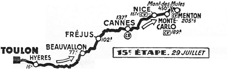 - Le ravitaillement a lieu à Cannes (km 137). En vue d'Antibes (km 150), Lambrecht crève et "rentre" sans problème. A Villefranche (km 173) la course s'anime enfin. C'est le Marseillais Rémy qui attaque. Il prend 15" au peloton et la réaction se déclenche immédiatement par Impanis, Molinéris, Moineau, Diederich, Lauredi & Castelin. Dans le Mont des Mules (km 194), un petit col situé à 10 km du but, Rémy est repris par ses poursuivants et aussitôt la jonction, le Luxembourgeois Diederich fausse compagnie à ses compagnons et personne ne le reverra. Il franchit la ligne largement détaché. Le petit groupe d'échappés va s'éparpiller avant la ligne. Bauvin & Goasmat vont s'intercaler. Le peloton est réglé 5'04" plus tard par Georges Meunier.