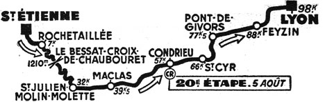 10h00 Saint-Étienne (km 0) - Rochetaillée (km 7) - Le Bessat (km 17.5) - Croix-Chaubouret (km 18.5-GPM3) - Graix (km 23.5) - Colombier (km 28) - St-Julien Molin-Molette (km 32) - Sajnt-Apolinard (km 36) - Maclas (km 39.5) - Lupe (km 41.5) - St-Pierre de Bœuf (km 46) - Chavanay (km 50) - Vérin (km 55) - Condrieu (km 57-ravitaillement) - Tupin (km 60) - Ampuis (km 62) - Saint-Cyr (km 66) - Sainte-Colombe (km 68) - St-Romain en Gai (km 69) - Loire sur Rhône (km 74) - Pont-de-Givors (km 77.5) - Flévieu (km 79.5) - Feyzin (km 88) - St-Fons (km 94) - Lyon / Stade-vélodrome (km 98).