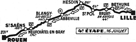 - A Béthune (km 35), la jonction est faite entre le groupe de tête — qui a perdu Redolfi sur crevaison, mais qui reviendra, et les neuf poursuivants. Au km 40, le deuxième peloton est à 4'50". Kallert perce et, en compagnie de Croci-Torti qui l'a attendu, est absorbé par le groupe Marinelli dont le retour vers la tête a été favorisé par les bonnes routes retrouvées et le soleil revenu. Alors, l'écart n'est plus que de 1'30". Le regroupement total s'effectue au km 70.