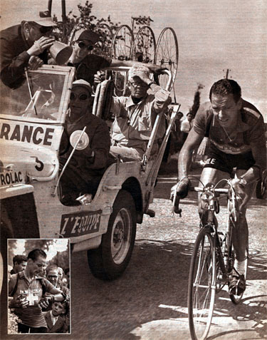 En route vers la légende, Hugo Koblet encouragé par son directeur sportif. En médaillon, il consulte sa montre pour mesurer l'écart. (photo But & Club / Le Miroir des Sports n° 304 du 16 juillet 1951).