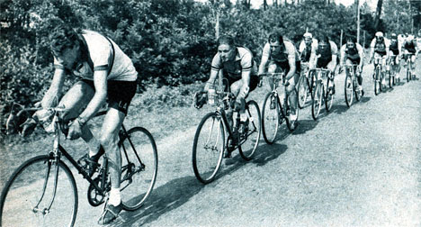 L'arrivée à Dax n'est plus très loin et Meunier fonce devant De Mulder, Muller, Caput, Marinelli etc... (photo Miroir Sprint du 19 juillet 1951).