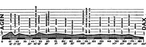 11h30 (Lot-et-Garonne) : Agen (km 0) - Aubiac (km 7) - Laplume (km 12) - Lamontjoie (km 17) - (Gers) : Ligardes (km 23) - Çondom (km 36) - Valence-sur-Baïse (km 44) - Ampeils par D112 (km 48) - Marsembat (km 58) - Vic-Fezensac (km 60) - Demu (km 71) - Manciet (km 83) - Nogaro (km 87) - Vergoignan (km 92) - Ste-Christie d'Armagnac (km 106) - (Landes) : Aire-sur-l'Adour (km 110) - Cazères-sur-l'Adour (km 118) - Bordère (km 123) - Grenade (km 128) - Saint-Sever (km 140) - Montaut (km 147) - Mugron (km 157) - Montfort (km 166) - Hinx (km 174) - Dax / Stade US Dacquoise (km 185).