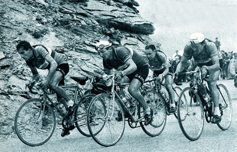 A 10 km de Lourdes, les favoris ne mènent pas une chasse vigoureuse. Toutefois, Bobet ne fait pas partie du groupe. Ici Koblet mène devant Bartali et Coppi qui deviennent (avec Géminiani) les grands favoris de ce Tour 51.(photo Miroir Sprint du 19 juillet 1951).