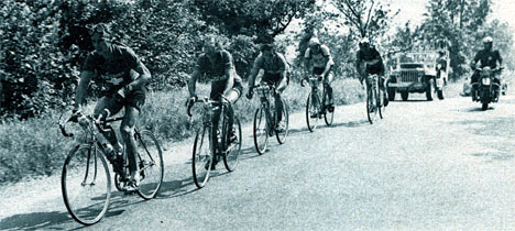 Géminiani emmène devant Biagioni, Lauredi et Bauvin. Van Ende a été décroché. (photo Miroir Sprint du 19 juillet 1951).