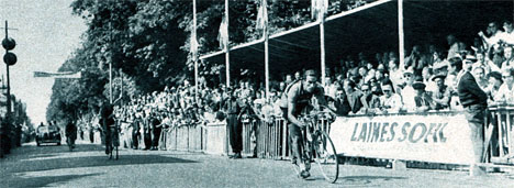 "Gem" s'impose et semble remporter sa 2ème étape mais Biagioni qu'on voit derrière lever le bras n'est pas de cet avis. Le Français sera déclassé (photo Miroir Sprint du 19 juillet 1951).