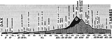- Diot rejoint à son tour le groupe de tête soit 12 hommes échappés. Le peloton ne semble pas prendre l'affaire au sérieux et les écarts se creusent : 3'15" au km. 80, 4' à Oloron (km 87), 6'05" après Ogeu (km 98), 9' au ravitaillement d'Arudy (km 106) et enfin 13'15" à Laruns (km 119), au pied du col d'Aubisque.