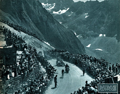 Bim Diederich est parti de loin et gravit seul le Tourmalet où il donnera des signes de lassitude dès la mi-pente. Ici, il va franchir le col au milieu d'une foule dense et disciplinée. (photo But & Club - Le Miroir des Sports n° 305 du 19 juillet 1951).