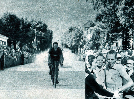 A Luchon, Hugo Koblet fait coup double étape + maillot jaune. (photo Miroir Sprint du 19 juillet 1951).