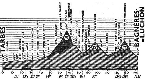 12h00 (Hautes-Pyrénées) : Tarbes (km 0) - Adé (km 13) - Lourdes (km 18) - Lugagnan (km 21) - Agos (km 26) - Vidalos (km 27) - Ost (km 28) - Ayzac (km 29) - Argelès-Gazost (km 31) - Pierrefitte-Nestalas (km 37) - Luz (km 49) - Barèges (km 56) - Col du Tourmalet (km 67-GPM1) - Artigues (km 77) - Gripp (km 80) - Ste-Marie de Campnan (km 84-ravitaillement) - Lascoube (km 87) - Espiadet (km 92) - Col d'Aspin (km 97-GPM2) - Arreau (km 110) - Bordères-Louron (km 115) - Anéran (km 120) - Col de Peyresourde (km 128-GPM2) - (Haute-Garonne) : Garin (km 134) - Cazaux (km 135) - Bagnères de Luchon / Allées d'Étigny (km 142).