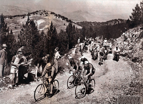 Sur le revêtement caillouteux du Mont-Ventoux, Koblet emmène Géminiani et Lazaridès en danseuse et Gino Bartali. (photo But & Club - Miroir des Sports n° 306 du 23 juillet 1951).