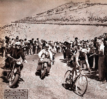 A 1 km du sommet, Lucien Lazaridès, remarquable d'aisance, s'envole et passe le Ventoux 40 secondes avant Bartali. (photo But & Club - Miroir des Sports n° 306 du 23 juillet 1951).