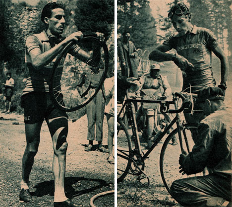 Deux incidents majeurs sur le déroulement de l'étape : la crevaison de Géminiani dans la vallée entre Vars et Izoard, celle de Koblet dans la descente de l'Izoard. (photo But et Club - Le Miroir des Sports n° 307 du 27 juillet 1951).