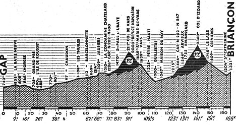 - Au ravitaillement de Guillestre (km 110), au bas de la descente du col de Vars, les pointages donnent : Coppi en tête, à 1'20" Buchonnet, à 7'25" Koblet, à 8'05" Bartali & Géminiani, à 8'40" le groupe des favoris avec Verschuren, Biagioni, Goasmat, Ockers, Magni, Ruiz, Bauvin, L. Lazaridès, Marinelli, Barbotin, De Hertog, Cogan, M. Rodriguez & G. Weilenmann, à 9'55" Lauredi, à 10' Robic & Giguet, à 10'35" Teisseire, Deledda, Baeyens & Vitteta, à 10'50" un groupe avec Diederich, ..., Bobet, encore décevant, passe à 13'35" dans un groupe comprenant entr'autres Walkowiac et Sciardis.