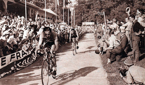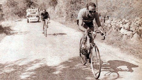 Hugo Koblet vient de dépasser Bartali parti 4' avant lui (photo Miroir-Sprint n° 268 du 30 juillet 1951).