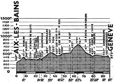 10h30 (Savoie) : Aix-les-Bains (km 0) - Albens (km 10) - Rumilly (km 19) - Vallières (km 23) - Hauteville (km 27) - Nonglard (km 32) - Lovagny (km 35) - Poisy (km 38) - Meythet (km 42) - Metz (km 44) - Carr. N201-N203 (km 45) - Le Plot (km 56) - La Roche-sur-Foron (km 72-ravitaillement) - Findrol (km 81) - Nangy (km 83) - Arthaz (km 85) - Annemasse (km 91) - Ville-la-Grand (km 92) - SUISSE / Frontière (km 93) - Vandoeuvres (km 95) - Genève / Stade de Frontenex (km 97).