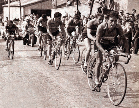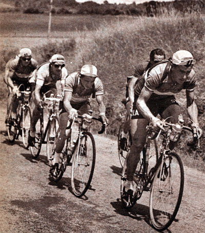 Vers le km 40, la tentative des cadors : Bobet devant Koblet, Marinelli, Voorting, Barbotin, Coppi (caché). Ils seront repris avant Beauvais.