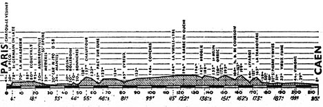 11h00 (Seine-et-Oise) : Paris - Chatou (km 0) - Le Vésinet (km 1) - Le Fecq (km 3) - Saint-Germain (km 4) - Chambourcy (km 8) - Ecquevilly (km 18) - Flins (km 22) - Aubergenville (km 23) - Epône (km 25) - Mézieres (km 27) - Mantes (km 35) - Rosny (km 42) - Rolleboise (km 45) - Bonnières (km 43) - Chauffour (km 55) - (Eure) : Pacy-sur-Eure (km 63) - Évreux (km 81) - Saint-Sébastien (km 83) - Glisolles (km 93) - Conches (km 99) - La Vieille Lyre (km 115) - La Barre-en-Ouche (km 122) - Broglie (km 135) - Saint-Aubin (km 139) - Saint-Belin (km 143) - La Vespière (km 145) - (Calvados) : Orbec (km 146-ravitaillement) - Notre-Dame de Courson (km 158) - Livarot (km 166) - Sainte-Marguerite (km 175) - Saint-Pierre-sur-Dives (km 184) - Magny-la-Campagne (km 189) - Vieux-Fumé (km 190) - Vimont (km 199) - Cagny (km 204) - Caen / Bd. circulaire de la Prairie (km 215).