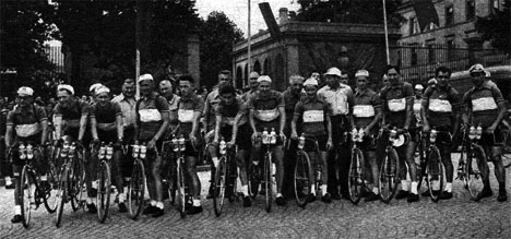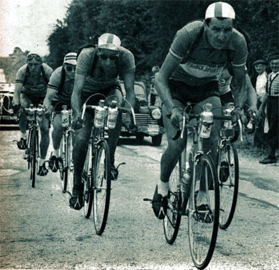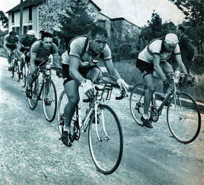 Les 5 hommes partis à St-Denis-le-Méré (km 40) et que personne ne reverra avant l'arrivée. Au premier plan Van Est suivi de Bauvin, Lévêque à droite. (photo But & Club / Miroir des Sports n° 303 du 12 juillet 1951)