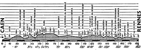 11h15 (Calvados) : Caen (km 0) - Fleury (km 2) - Saint-Martin-de-Fontenoy (km 6) - May (km 8) - Laizé-la-Ville (km 10) - Saint-Laurent-de-Contel (km 16) - Les Moutiers-en-Cinglais (km 17) - Croisilles (km 21) - Thury-Harcourt (km 24) - Saint-Rémy (km 31) - Saint-Denis-de-Meré (km 40) - Condé-sur-Noireau (km 43) - (Orne) : Saint-Georges-des-Groseillers (km 52) - Flers (km 55) - La Chapelle-aux-Moines (km 59) - Le Chatellier (km 63) - Domfront (km 75) - Rouelle (km 81) - (Manche) : Saint-Georges-de-Rouellay (km 84) - Barenton (km 89) - Saint-Jean-du-Corail (km 93) - Milly (km 100) - Le Pointon (km 103) - Parigny (km 105) - Saint-Hilaire-du-Harcouët (km 107-ravitaillement) - Les Loges-Marchis (km 111) - (Ille-et-Vilaine) : Louvigné-du-Désert (km 119) - Landéan (km 127) - Fougères (km 135) - Romagné (km 141) - Saint-Marc-sur-Couesnon (km 149) - Saint-Jean-sur-Couesnon (km 151) - Saint-Aubin-du-Cormier (km 155) - Gosne (km 159) - Liffré (km 164) - Fouillard-Thorigné (km 173) - Rennes / Vélodrome (km 182).