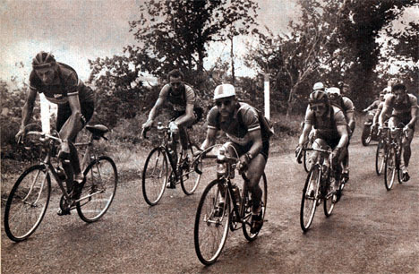 La bagarre va bientôt se déclencher. On reconnait Bauvin devant Robic, Coppi devant Koblet, et Géminiani à droite. (photo But & Club / Le Miroir des Sports n° 304 du 16 juillet 1951).