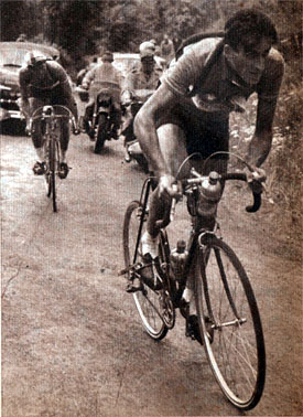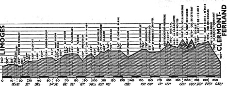 - Géminiani chute et perd un peu de temps dans la descente du col de Ceyssat tandis que Koblet perce à deux reprises, mais celui-ci revient au prix d'une belle poursuite. On pense que Robic va revenir sur Géminiani mais une crevaison lui ôte ses illusions. Le parcours emprunte ensuite un faux-plat montant jusqu'au col des Goules.