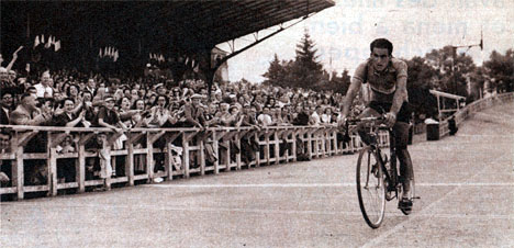 Raphael Géminiani remporte sur "son" vélodrome une étape qu'il avait repérée depuis longtemps. (photo Miroir Sprint n° 266 du 16 juillet 1951).