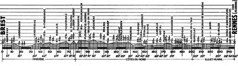 10h00 (Finistère) : Brest (km 0) - Guipavas (km 5) - Landerneau (km 18) - Landivisiau (km 34) - Saint-Thégonnec (km 44) - Morlaix (km 57) - Plouigneau (km 67) - Le Ponthou (km 72) - Saint-Laurent-Plouegat (km 75) - (Côtes-du-Nord) : Plounerin (km 80) - Kéramanach (km 83) - Plounevez-Moëdec (km 87) - Belle-Isle-en-Terre (km 91-ravitaillement) - Louargat (km 96) - Grâces (km 107) - Guingamp (km 111) - Plouagat (km 123) - Châtelaudren (km 125) - Trémuson (km 135) - Saint-Brieuc (km 143) - Langueux (km 147) - Yffiniac (km 150) - Saint-René (km 153) - Lamballe (km 163-ravitaillement) - Noyal (km 167) - Plestan (km 171) - Langouhèdre (km 179) - Broons (km 190) - Saint-Jouan-de-1'Isle (km 200) - (Ille-et-Vilaine) : Quédillac (km 203) - Montauban-de-Bretagne (km 212) - Bédée (km 220) - Saint-Gilles (km 229) - Rennes / École d'Agriculture (km 238) - Rennes / Stade-Vélodrome (km 246).