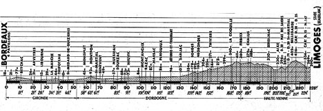 9h40 (Gironde) : Bordeaux / Bastide (km 0) - Les Quatre-Pavillons (km 1) - Beychac (km 11) - Arveyres (km 21) - Liboume (km 26) - La Marche (km 34) - Tripoteau (km 39) - St-Médard-de-Guizières (km 46) - Camps (km 48) - Saint-Seurin (km 50) - (Dordogne) : Menesplet (km 58) - Montpon (km 63) - Saint-Martial (km 67) - Bénévent (km 70) - Mussidan (km 80) - Sourzac (km 83) - Neuvic / Théorac (km 91) - Montanceix (km 101) - Razac (km 104) - Marsac (km 110) - Périgueux (km 115-ravitaillement) - Antonne-et-Trigonant (km 123) - Barliac (km 130) - Sorges (km 139) - Négrondes (km 143) - Thiviers (km 152) - La Coquille (km 168) - Firbeix (km 175) - (Haute-Vienne) : Chalus (km 181) - Sereilhac (km 196) - Aixe (km 203) - Mas-des-Landes (km 206) - Saint-Martial (km 211) - Bellegarde (km 214) - Limoges / Stade Beaublanc (km 228).