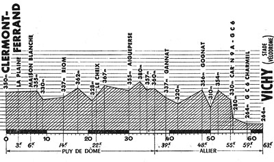 (Puy-de-Dôme) : Clermont-Ferrand (km 0) - La Plaine (km 3) - Maison-Blanche (km 6) - Riom (km 14) - Le Cheix (km 22) - Aigueperse (km 30) - (Allier) : Gannat (km 39-ravitaillement) - Cognat (km48) - Charmeil (km 59) - Vichy / stade vélodrome (km 63).