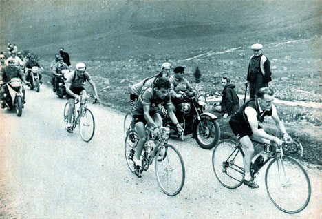 Dans le Tourmalet, Robic (porteur du maillot vert) et Le Guilly viennent de rejoindre le maillot jaune Schaer (caché derrière Le Guilly) et Lorono. Ils ne tarderont pas à les distancer