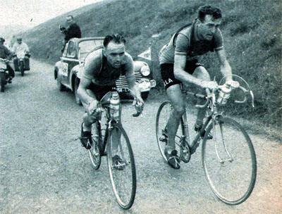 Le tandem Bobet / Bauvin dans Peyresourde. Ils reprendront du temps à Robic et, contrairement à Schaer, limiteront les dégâts à Luchon